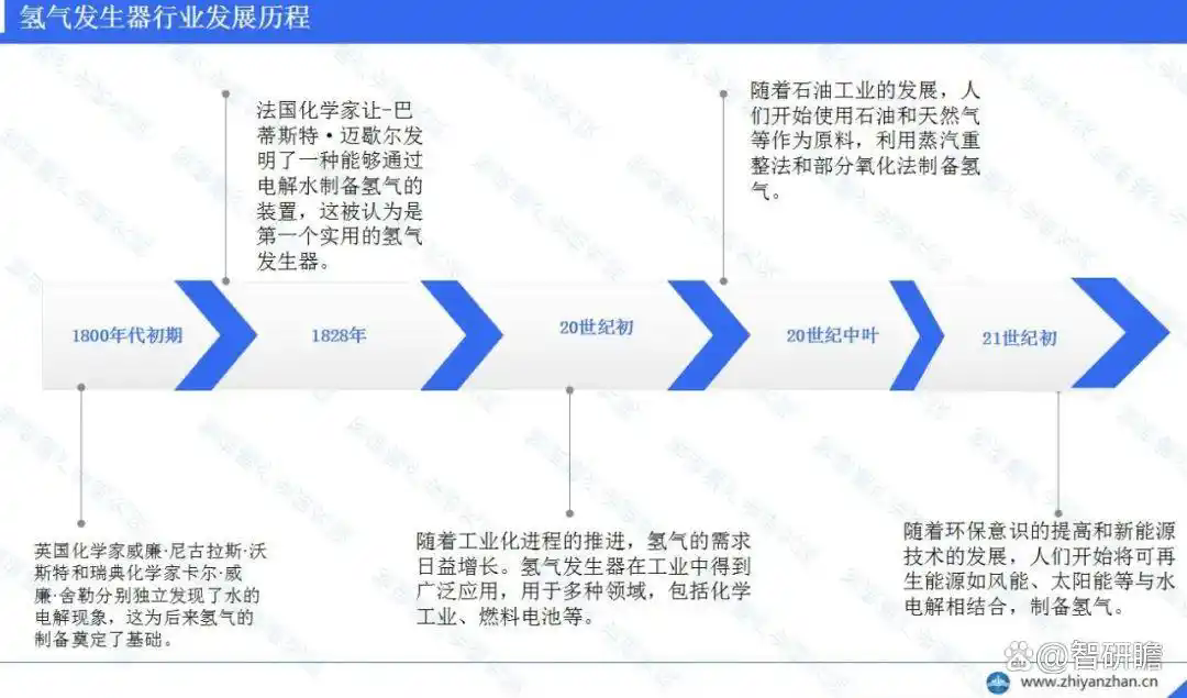20世紀初隨著工業(yè)化進程的推進,氫氣的需求日益增長。20世紀中葉隨著石油工業(yè)的發(fā)展,人們開始使用石油和天然氣等作為原料,利用蒸汽重整法和部分氧化法制備氫氣。21世紀初隨著環(huán)保意識的提高和新能源技術的發(fā)展,人們開始將可再生能源如風能、太陽能等與水電解相結合,制備氫氣。同時,氫氣發(fā)生器也開始應用于人們的日常生活,如用于飲用水的凈化、健康保健等領域。
